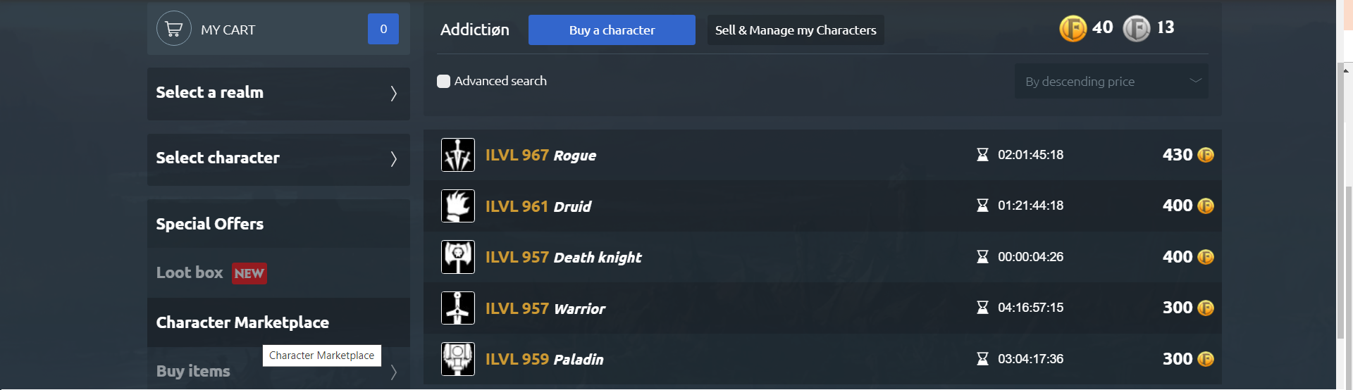 Posted August 9, 2021 The char booster is meant to replace the Legion market. Some people experienced account theft or got scammed via the above, so it was decided it was best to keep it shop side regulated, and not allowing char sells for individuals, unless you play on legion. Share this post Link to post Share on other sites